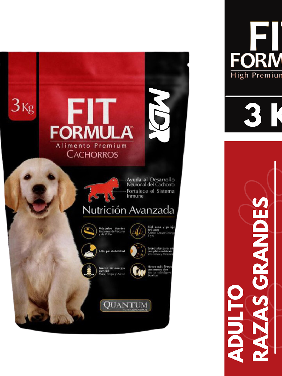 FIT FORMULA® Cachorro, es un alimento completo y balanceado desarrollado con ingredientes de alta digestibilidad, satisfaciendo todos los requerimientos nutricionales de su cachorro desde el destete hasta su adultez. También es recomendable para alimentar a hembras preñadas y en período de lactancia.