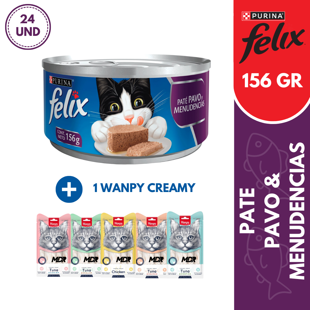 Alimento balanceado y completo húmedo para gatos adultos de todas las razas FELIX®. Paté pavo y menudencias con una suave y agradable textura en formato lata. Si tienes la suerte de tener un gato astuto como Felix® ¡Sorpréndelo con diferentes y sabrosas combinaciones todos los días!