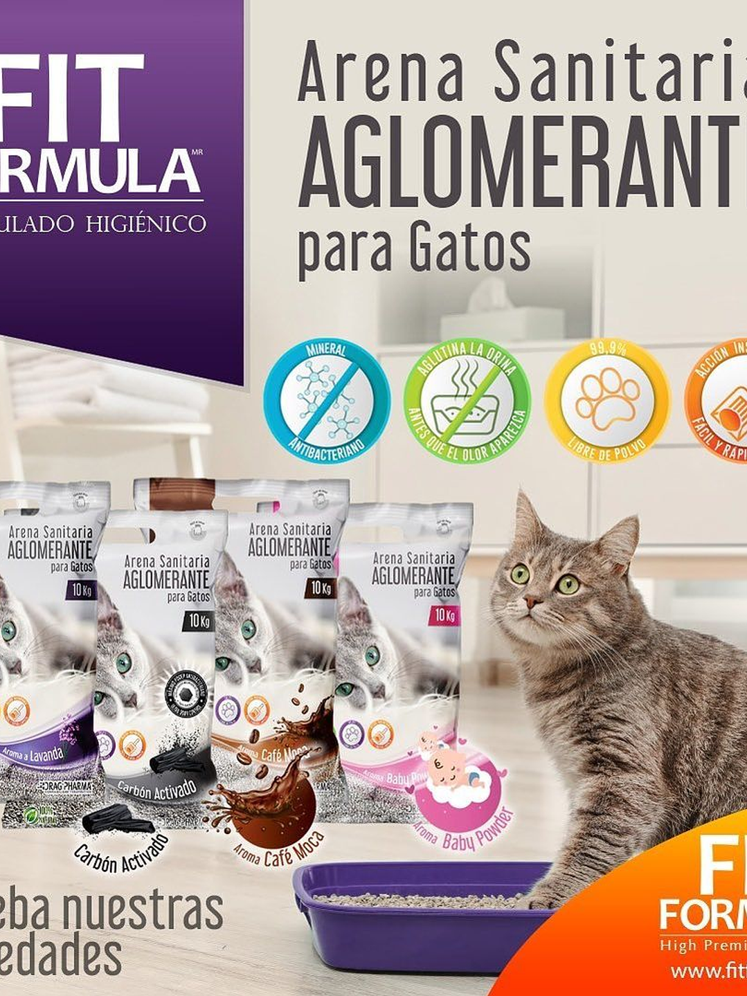 Arena sanitaria FIT FÓRMULA Aglomerante neutraliza automáticamente éstas toxinas protegiendo la salud del animal.